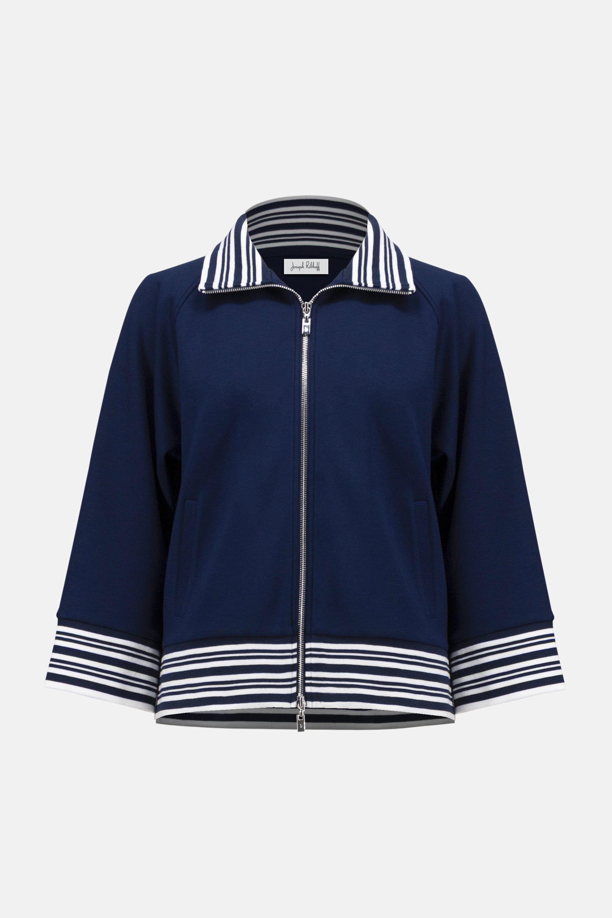 Elevate your everyday layering with this scuba jersey jacket, designed to combine sporty style with a polished finish. Featuring a sleek metallic front zipper, striped...