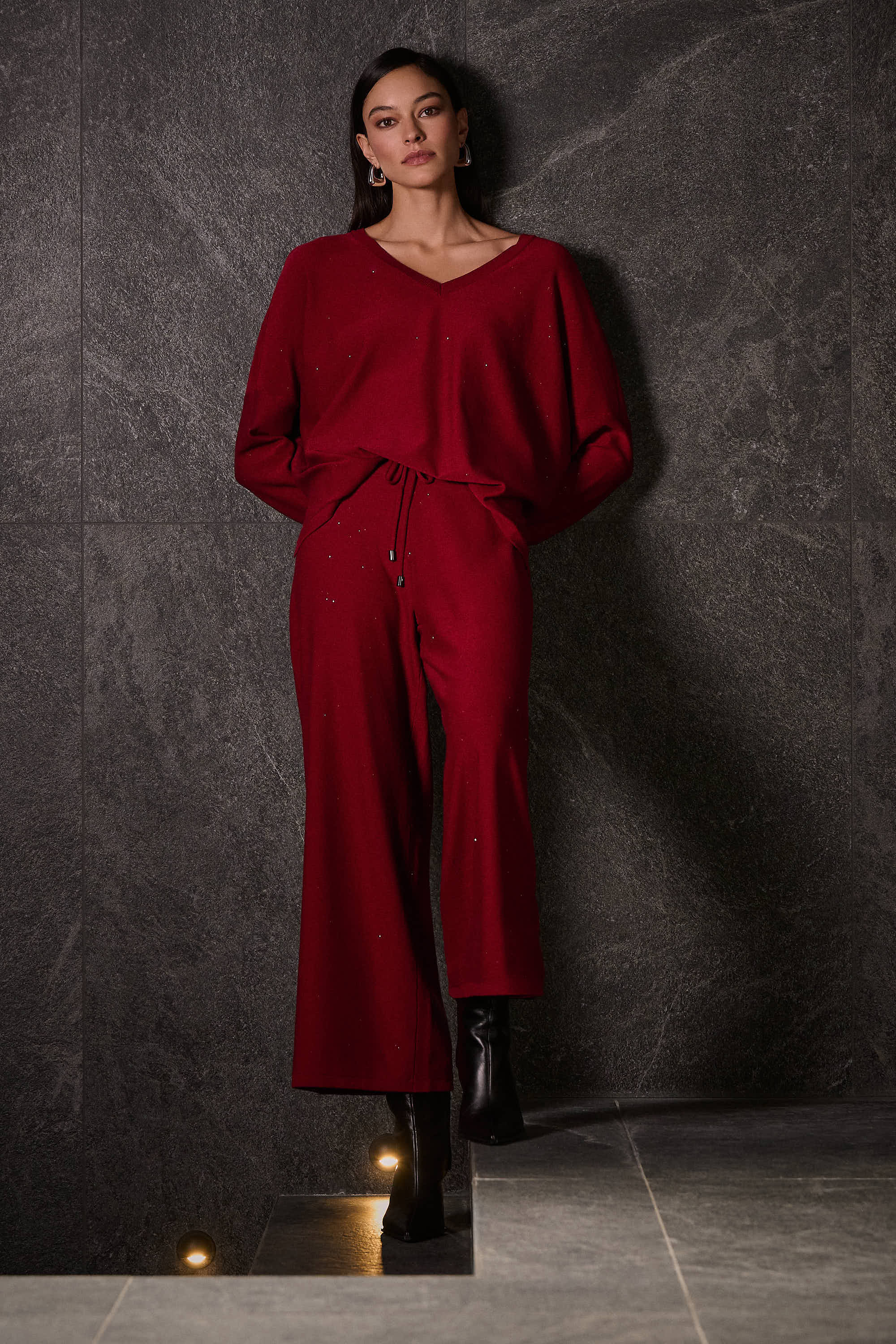 Step into effortless elegance with these viscose blend sweater knit culotte pants adorned with shimmering sequins. Designed for both comfort and style, they feature a...